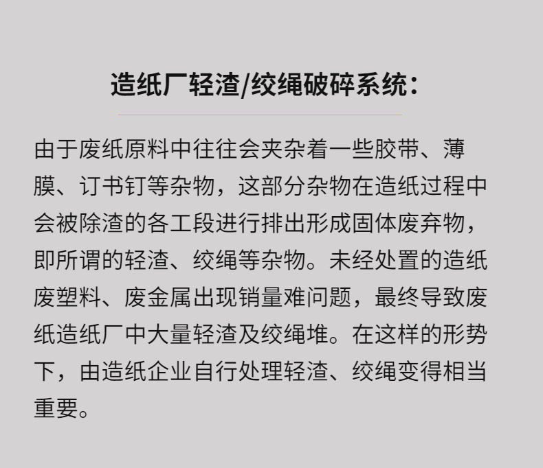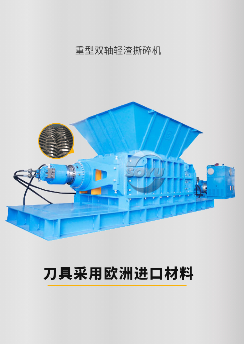 專業針對紙廠輕渣,絞繩等廢棄物而設計,整機技術來源于歐洲,采用微電腦(PC)自動控制,設啟動、停止、反轉及超載自動反轉控制功能,具有低速、大轉矩、低噪音等特點,軸承座采用對開型式,拆裝換刀容易方便適合撕碎特大、特厚難碎物料。