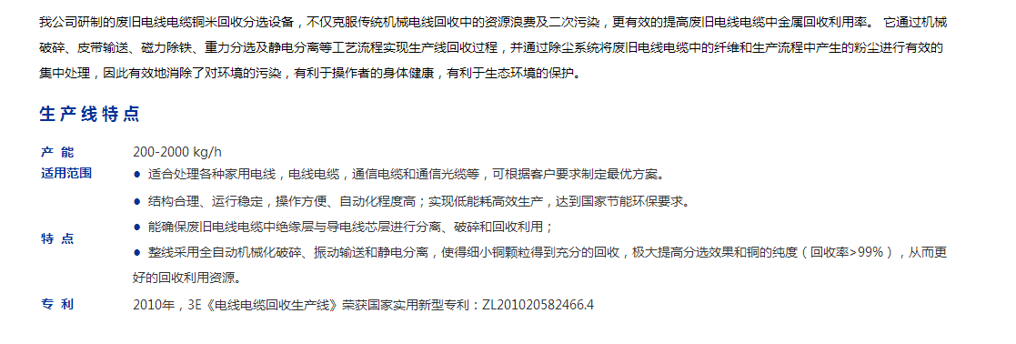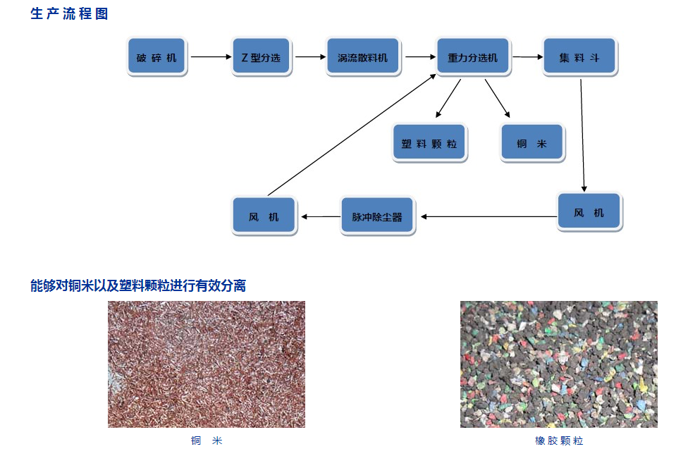 該銅米機是我公司自主研發的回收線之一,通常用來生產銅和回收塑料顆粒。具有結構合理,運行穩定等特點。它只需要喂料一次,配備分離器,該回收線具有大容量,我們可以根據客戶的要求進行相應的改裝。