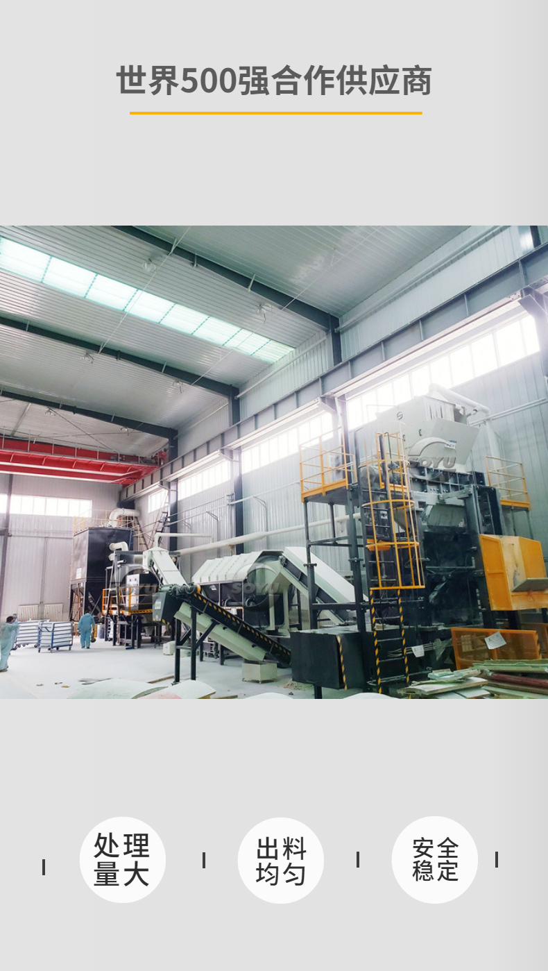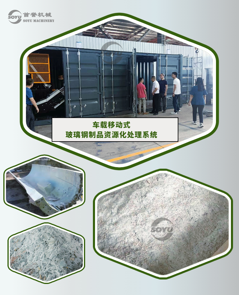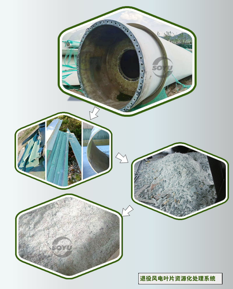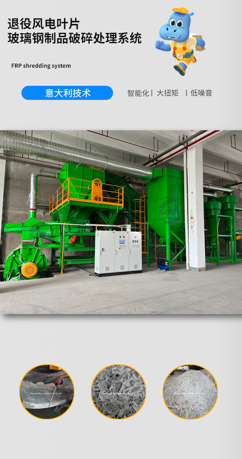 針對退役風電葉片(玻璃鋼)材質物料,首譽機械提供專業的退役風電葉片資源化成套處置系統,為批量無害化處置退役風機葉片探索出一條可行性和經濟性兼顧的技術途徑。