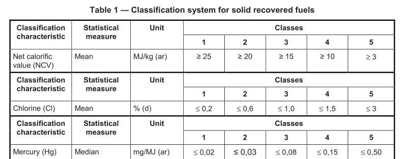歐洲標準BS EN 15359-2011,它對SRF燃料進行5個等級的質量分類。里面的SRF燃料指的是solid recovered fuels,也就是沒有毒性的固體回收燃料,包括城市固體廢物、一般工業固廢、污水污泥等,包含的組分有木材、紙張、織物、塑料、橡膠等等。