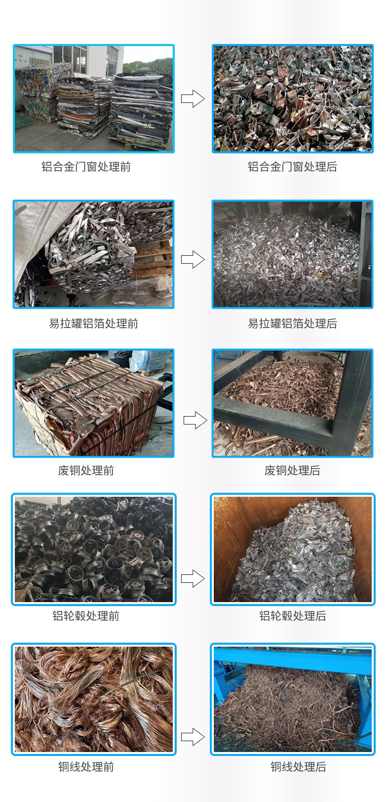 首譽機械自主研發生產的廢舊金屬破碎處理成套回收線主要是針對廢銅、廢鋼,廢鋁(打包鋁),發動機外殼等進行撕碎、分選等處理,便于回爐再生循環利用。
