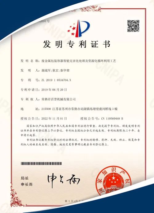 包裝容器無(wú)害化資源循環(huán)利用工藝專(zhuān)利證書(shū)危廢包裝容器資源化處理系統(tǒng):針對(duì)(機(jī)油濾芯、化工桶、涂料桶,機(jī)油壺、金屬包裝容器、塑料包裝容器)等危廢物料,首譽(yù)提供專(zhuān)用的危廢包裝容器資源化處理系統(tǒng),集撕碎、破碎、分離、除渣、分選、清洗等功能于一體,產(chǎn)量達(dá)到800-5000KG/H,安全性高,抗沖擊力強(qiáng)。刀片采用高強(qiáng)度合金鋼制成,擁有良好的耐磨性和強(qiáng)度。